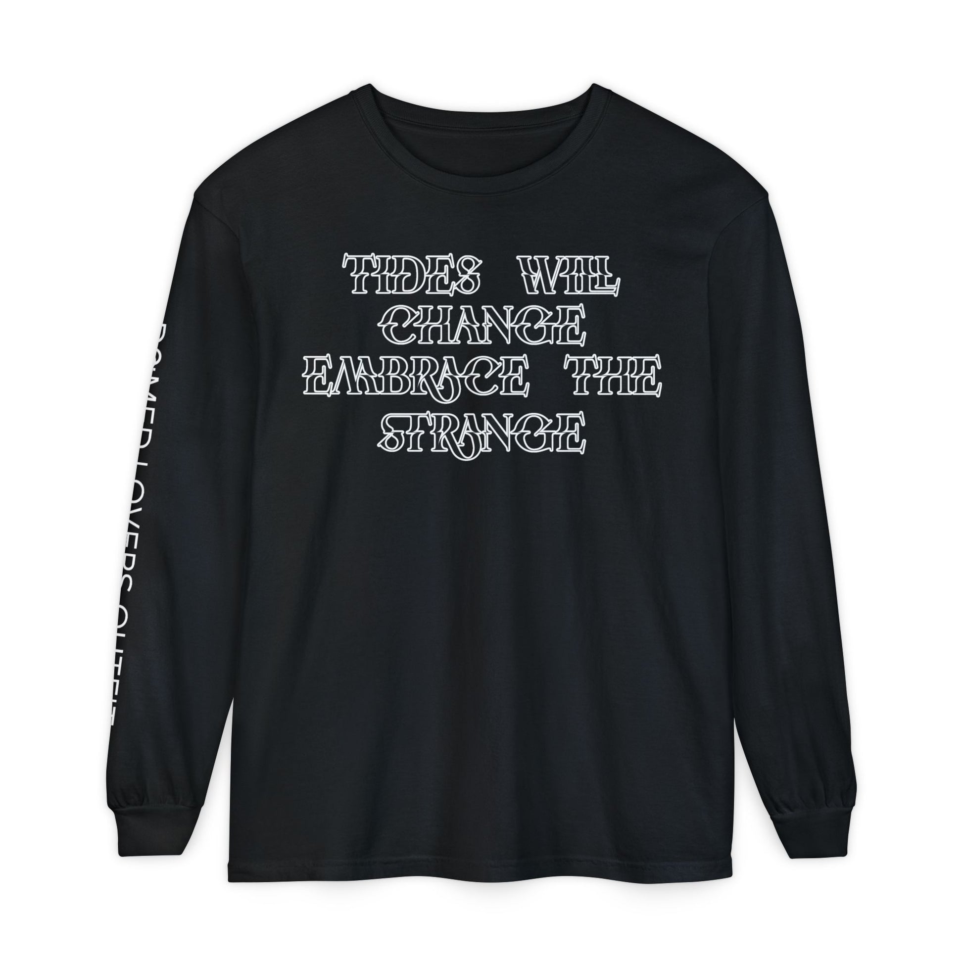This long-sleeve garment-dyed shirt carries a quiet, thoughtful energy — the kind that settles in during early morning walks by the water or late-night conversations under dim streetlamps. The front’s distressed stencil text reads like a gentle reminder to accept change, while the sleeve typography adds a subtle, personal touch when your arms move. Soft, worn-in color and a relaxed classic fit make it an easy layering piece over tees or under jackets. It’s for someone who favors comfort with meaning: the listener at the bonfire, the friend who journals their way through transitions, the wanderer who collects memories more than things.