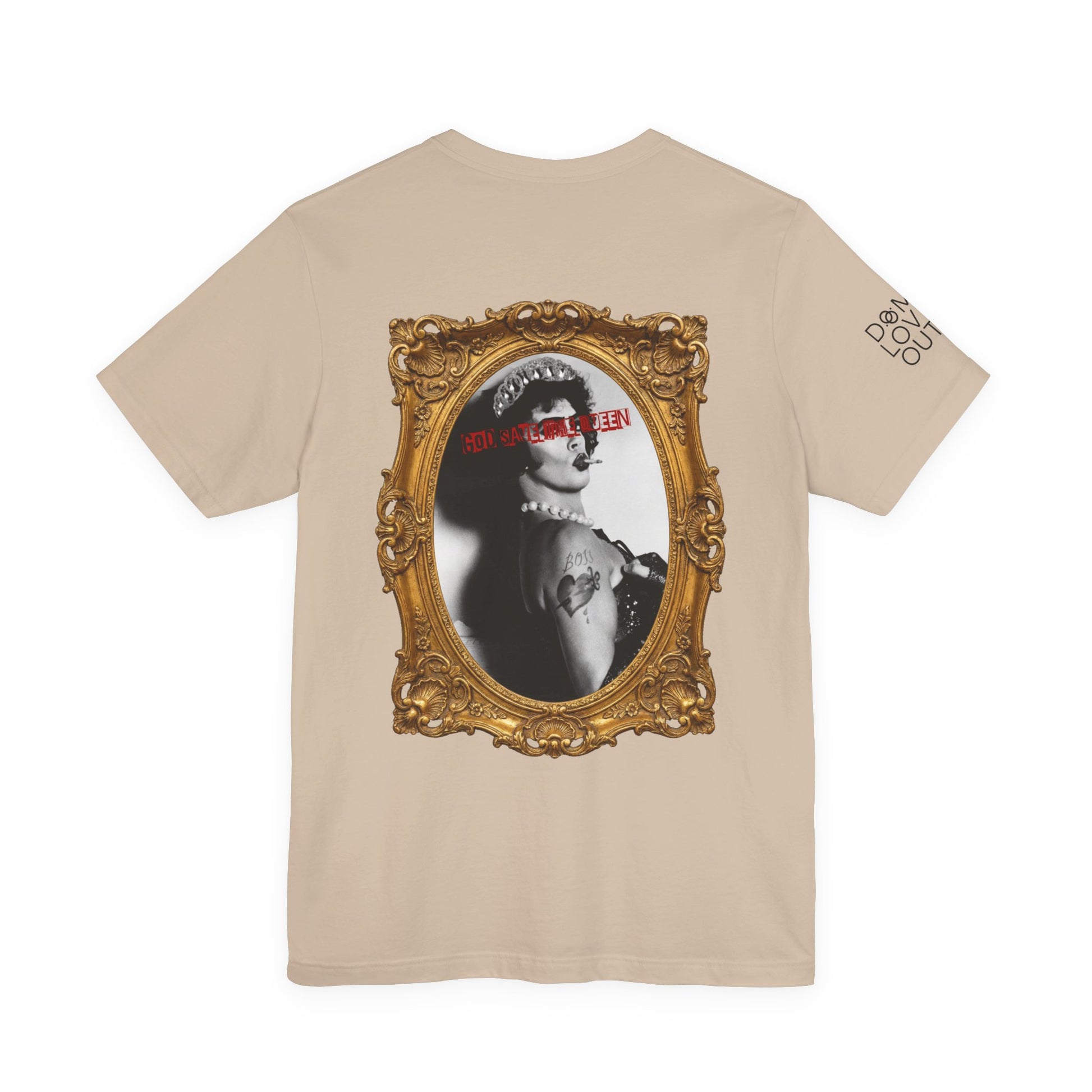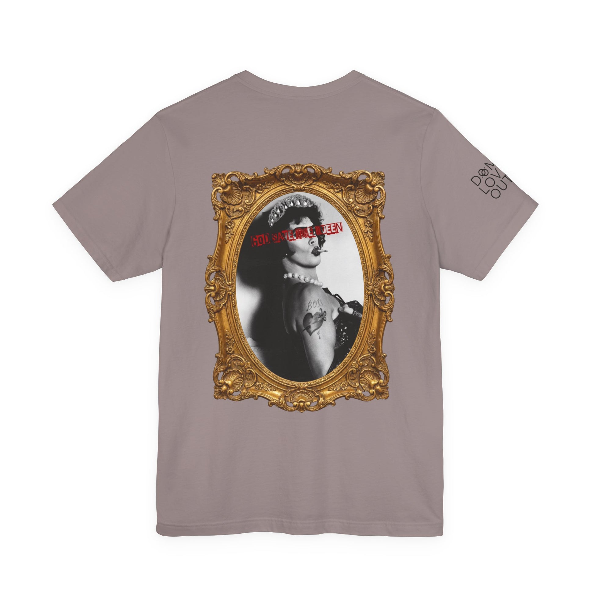 This lightweight jersey tee carries attitude in a quietly confident way. Soft, breathable Airlume cotton and a tidy crew neckline make it easy to layer under a jacket or wear solo. The front shows a small, edgy cherub with a guitar — a wink of mischief at the chest — while the back delivers the statement: a vintage portrait in a gilded frame, stamped with bold red type and modern tattoo details. It blends retro elegance and streetwise irony, the kind of shirt you reach for when you want to look put-together but not earnest. Comfortable enough for everyday wear, but detailed enough to start conversations at shows, gallery openings, or late-night hangs.